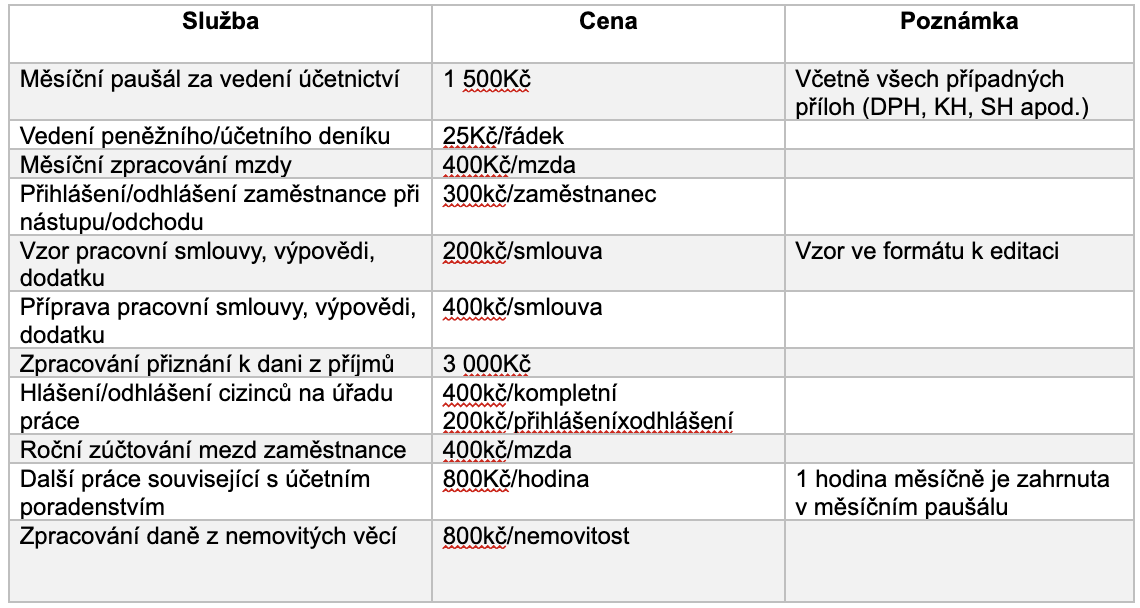 Ceník našich služeb je vytvořen pro různé typy klientů a jejich potřeby. Nabízíme individuální přístup a transparentní ceny, které jsou stanoveny v závislosti na rozsahu a složitosti poskytovaných služeb. Snažíme se vyjít vstříc potřebám našich klientů a nabízíme různé balíčky služeb, které jsou přizpůsobeny jejich specifickým požadavkům.